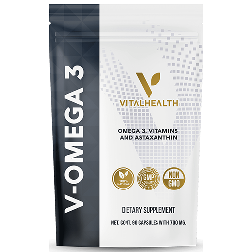 V-OMEGA 3 combines Omega 3, EPA, DHA, Tocotrienols, and Astaxanthin to support heart health, brain function, cognitive wellness, and provide antioxidant protection for overall cellular well-being and healthy aging.